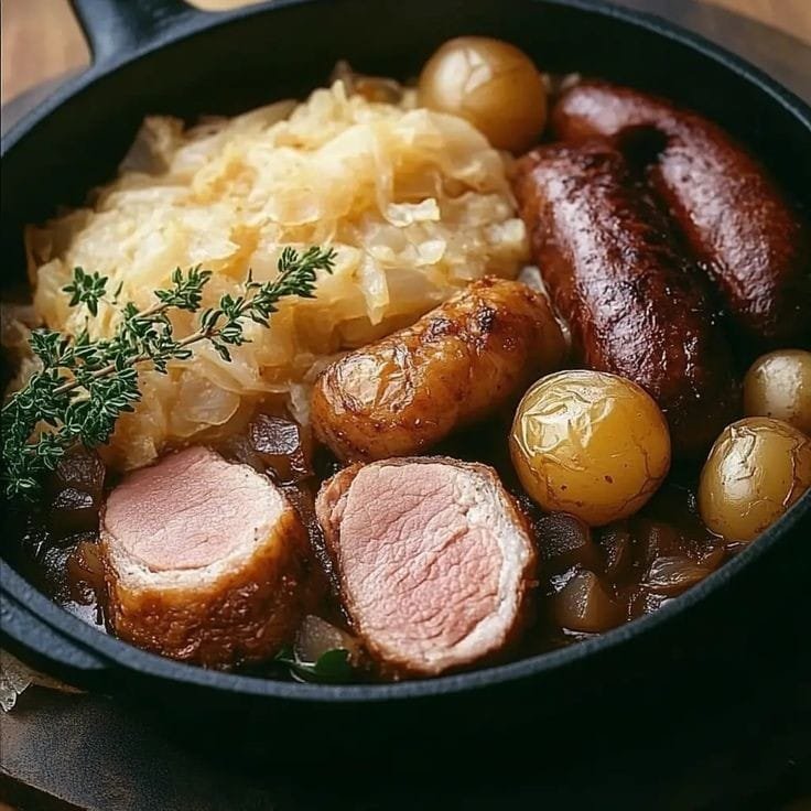 3. Disposer les morceaux de poitrine fumée sur la choucroute. Couvrir et cuire à feu doux pendant 1h30.
